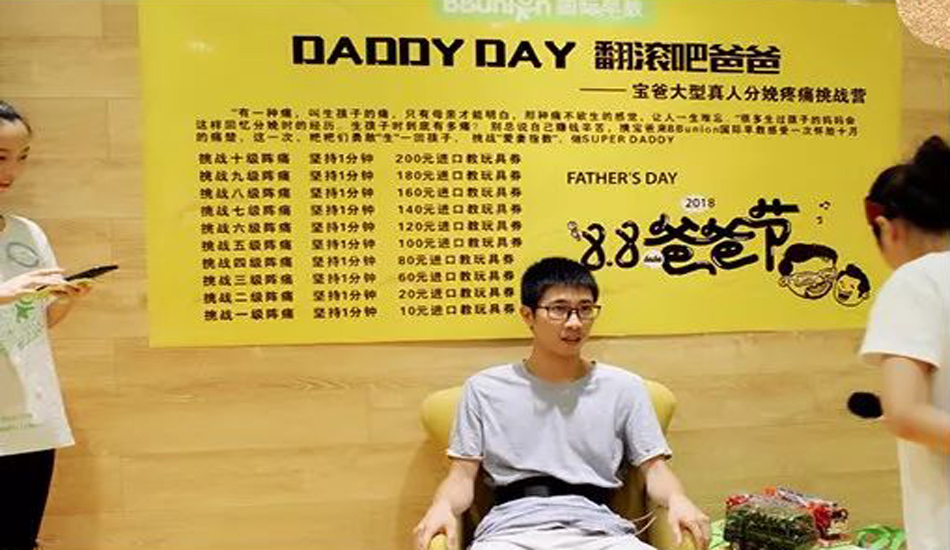 在这次体验活动中,妈妈们只需要默默地看着,而爸爸们则亲自上阵,感受一下分娩的疼痛到底有多大程度。